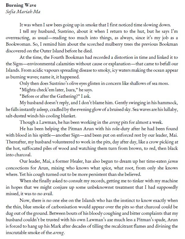 Sofia Mariah Ma is a Singaporean writer of Javanese descent. Her fiction has won awards in the Commonwealth Short Story Prize, and the Golden Point Award. She holds an MA in English Literature and is working towards her PhD in Creative Writing. Her latest works can be found in Suspect Journal and The Second Link: An Anthology of Malaysian & Singaporean Writing.