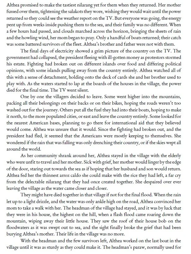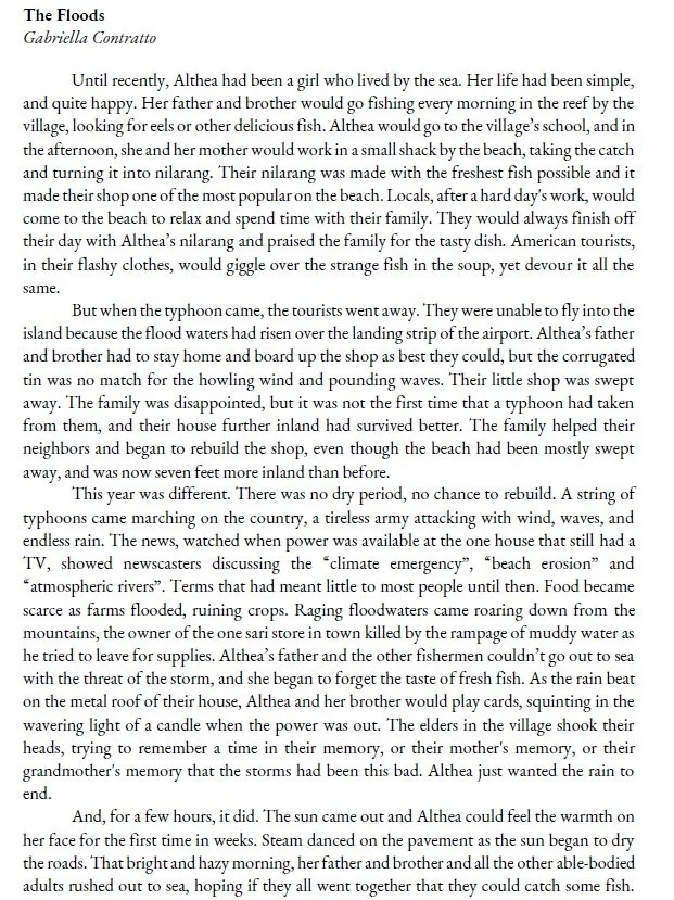 Gabriella Contratto just received her MA in English (Creative Writing) from UH Mānoa, where she was also an intern for Mānoa Journal. She favors prose writing, and is particularly fond of speculative fiction, but her interests include Filipino culture/diasporic writing, LGBT+ communities, sports and Angeleno communities. Her short story “Wait” was published in The Under Review. She is currently working on a YA urban-fantasy novel set in Los Angeles featuring a kidnapping, a vegan aswang, and a french fry obsessed anito.
