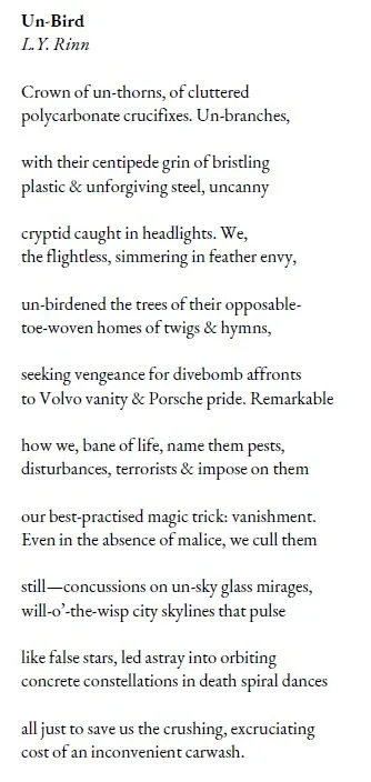 L.Y. Rinn is a Malaysian-Chinese game localization specialist and aspiring speech pathologist who loves danmei and mythology. Her poems have been featured or are upcoming in Pandan Weekly, Aster Lit, and Afterimages.